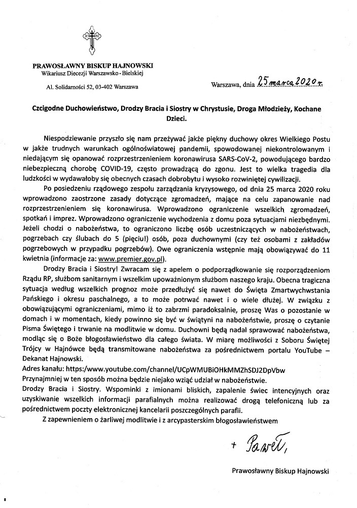 Wobec rozprzestrzeniającego się koronawirusa oraz wprowadzonych, w dniu 25-03-2020 r. nowych zasad bezpieczeństwa, związanych z obowiązującym w Polsce stanem epidemii. Jego Ekscelencja, Najprzewielebniejszy Paweł, Biskup Hajnowski zwraca się do wiernych ze słowami arcypasterskiej odezwy.